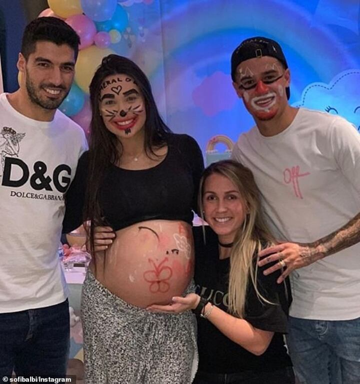The Brazilian star had his face painted along with Aine at their baby shower as Luis Suarez and his wife, Sofia Balbi, attended the celebrations.