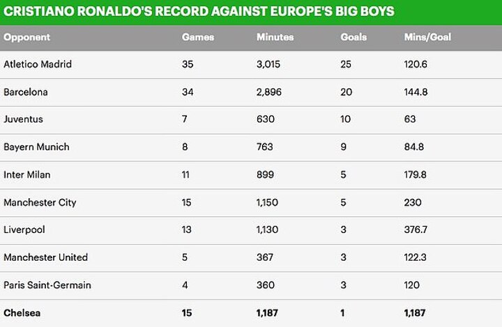 In 10 top-flight outings against the Blues, Ronaldo has never scored against them and that barren run stretches to 14 games when you add in appearances against Chelsea in the FA Cup, League Cup and Community Shield.