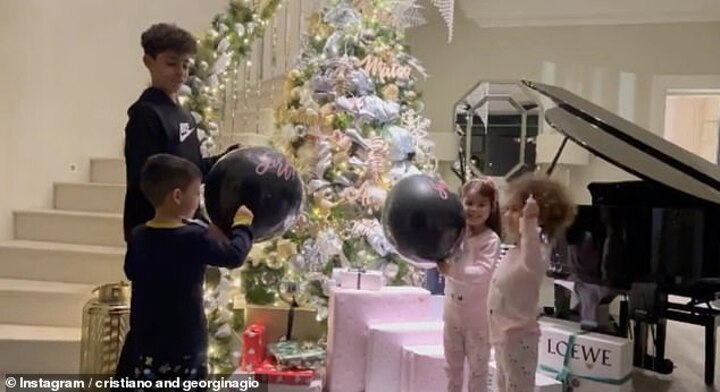 Eva’s twin Matteo and Cristiano’s eldest son Cristiano Jr, nicknamed Cristianinho, were in darker outfits to match the blue confetti that appeared when they burst theirs.
