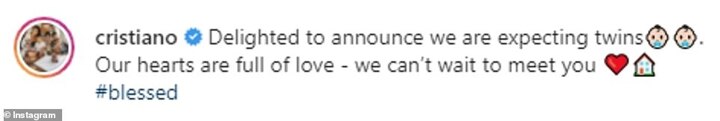 Ronaldo originally shared the news of Georgina's pregnancy with fans on social media, admitting their hearts are full of love.'