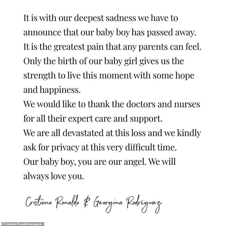However a statement released on Monday confirmed one of the couple's twins had died, with Ronaldo describing the loss as 'the greatest pain.'