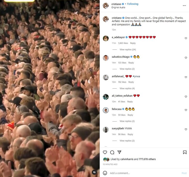 He wrote: 'One world… One sport… One global family… Thanks, Anfield. Me and my family will never forget this moment of respect and compassion.'