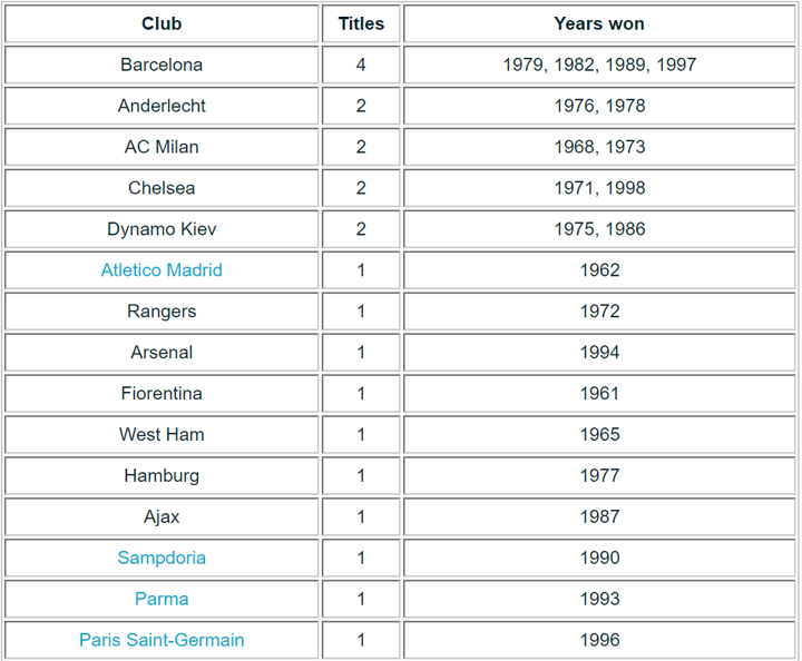 AC Milan, Chelsea, Anderlecht and Dynamo Kiev follow on two trophies each. After that there are 27 different champions, including the likes of Manchester United, Juventus, Bayern Munich, Ajax and Arsenal.