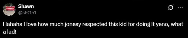 'Hahaha I love how much Jonesy respected this kid for doing it yeno, what a lad!' another wrote.
