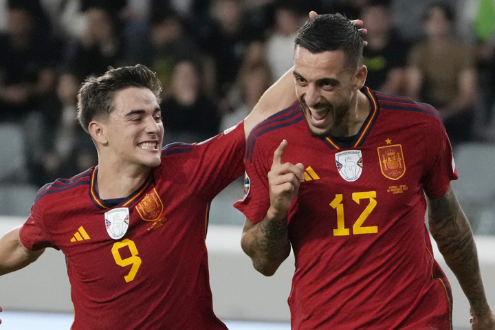 Spain XI: J. Navas, Joselu, Alejandro Grimaldo, Robin Le Normand, David Raya, Merino, Oyarzabal, P. Torres, Martín Zubimendi, Gavi, Lamine Yamal