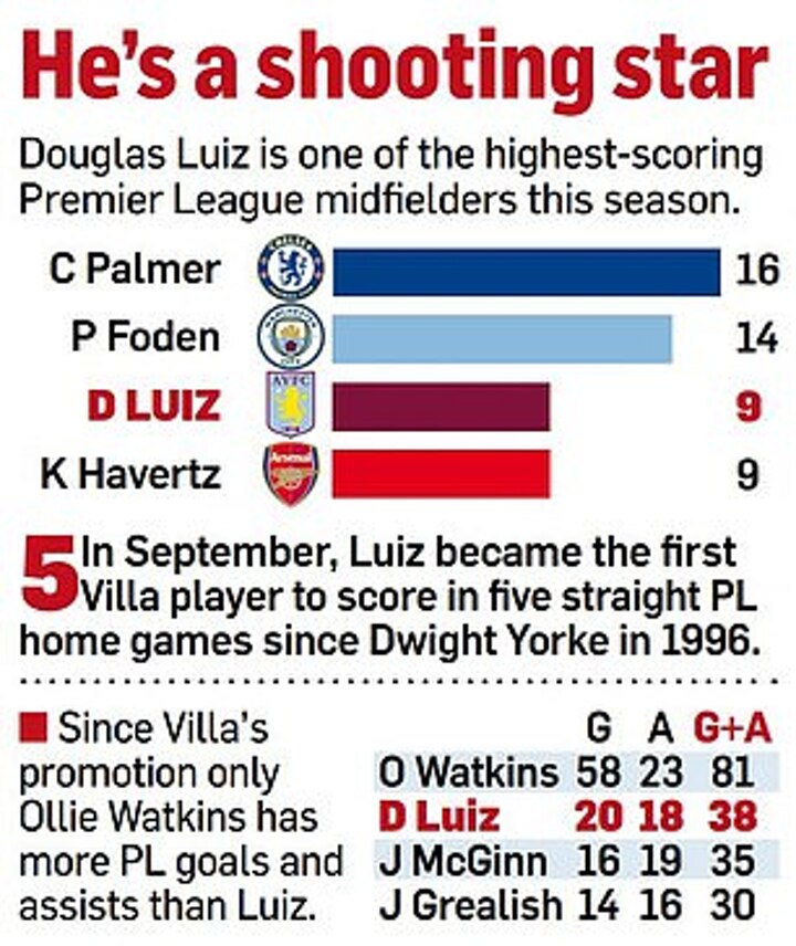 Luiz, an elegant and busy central midfield player, has been at the heart of Villa’s resurgence. He was the club’s Player of the Year last season and similarly influential this time round.