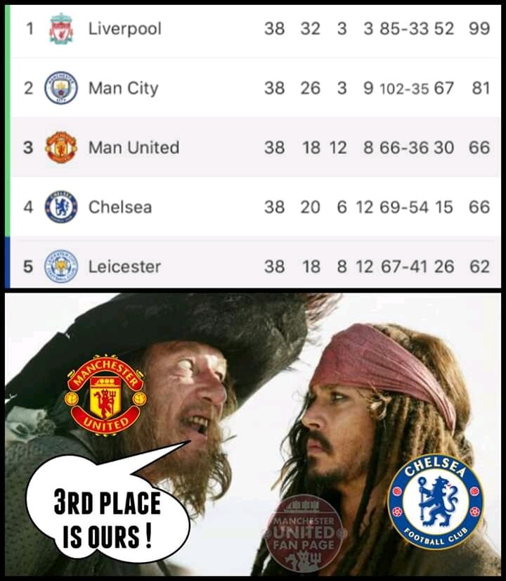 Chelsea fans : Sign Bruno - 5th 18 games unbeaten - 5th Ole's at the wheel - 5th Play Pogba and Bruno - 5th Score penalties - 5th At the end of the season, Man. United is 3rd and Chelsea is 4th....Moral lesson - He who laughs last, laugh best๐๐ฅ