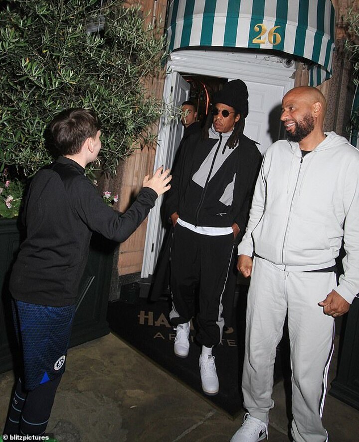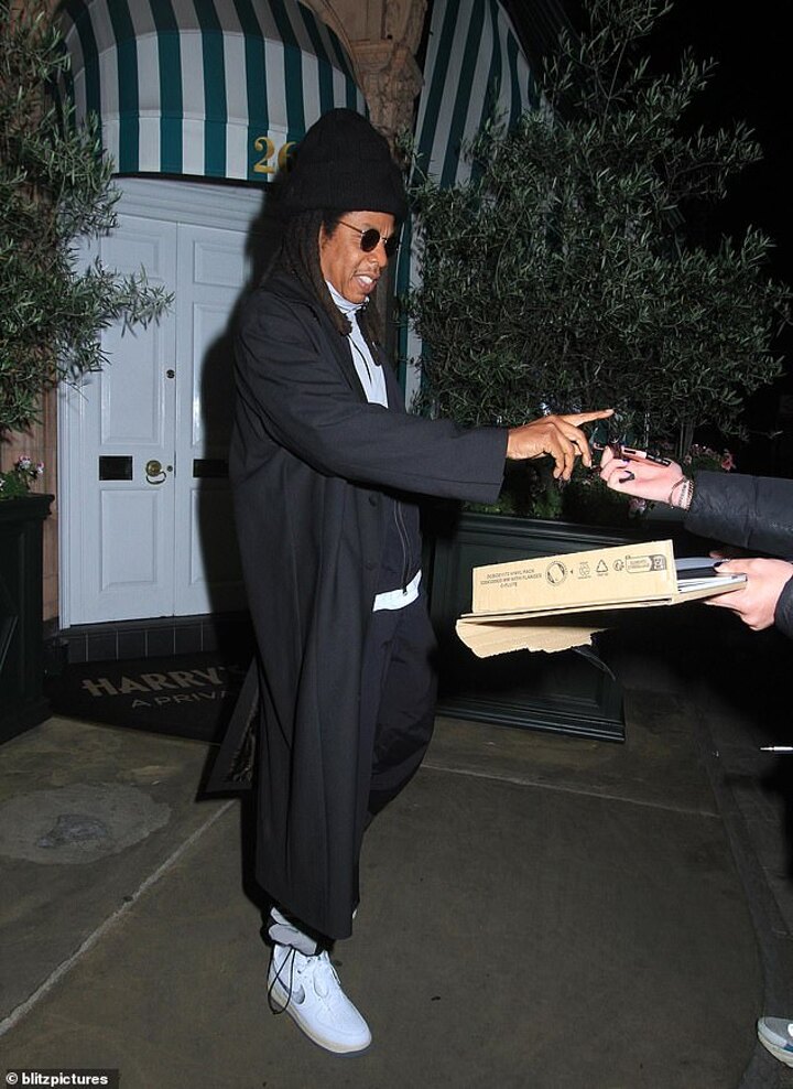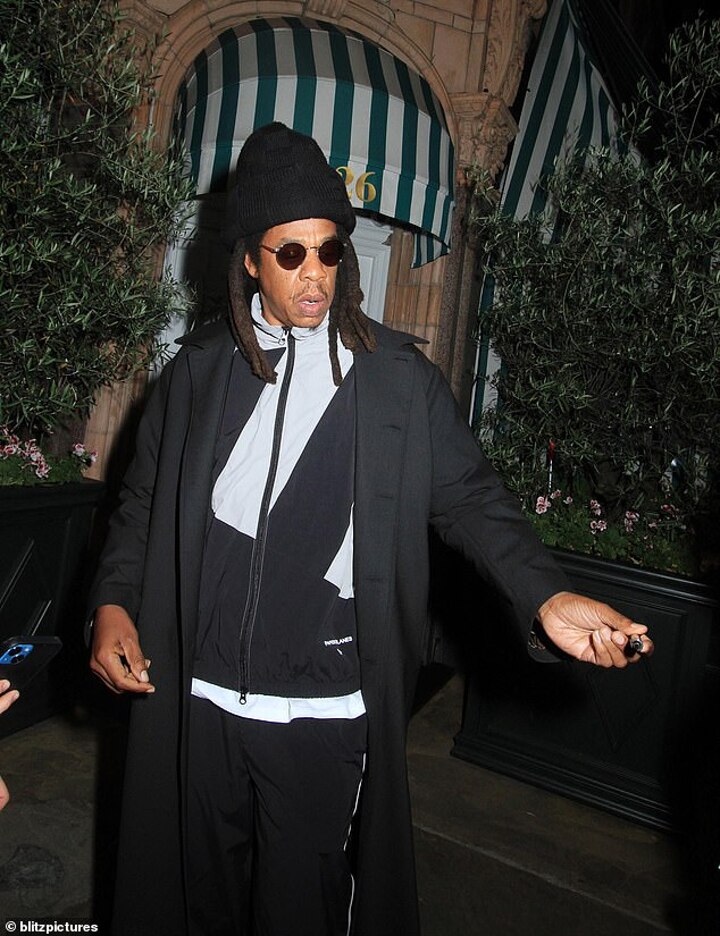 Jay-Z added a pair of white trainers and a black beanie, while hiding his face behind round sunglasses.