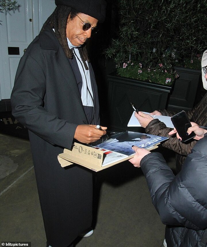 He looked effortlessly cool in grey zip-up jumper and matching jogging bottoms under a long black coat.