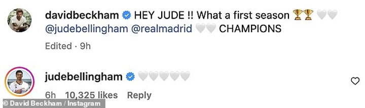 Captioning the joyful photo, David praised Real Madrid star Jude Bellingham for his incredible debut performance and victory, writing: 'HEY JUDE !! What a first season CHAMPIONS'.