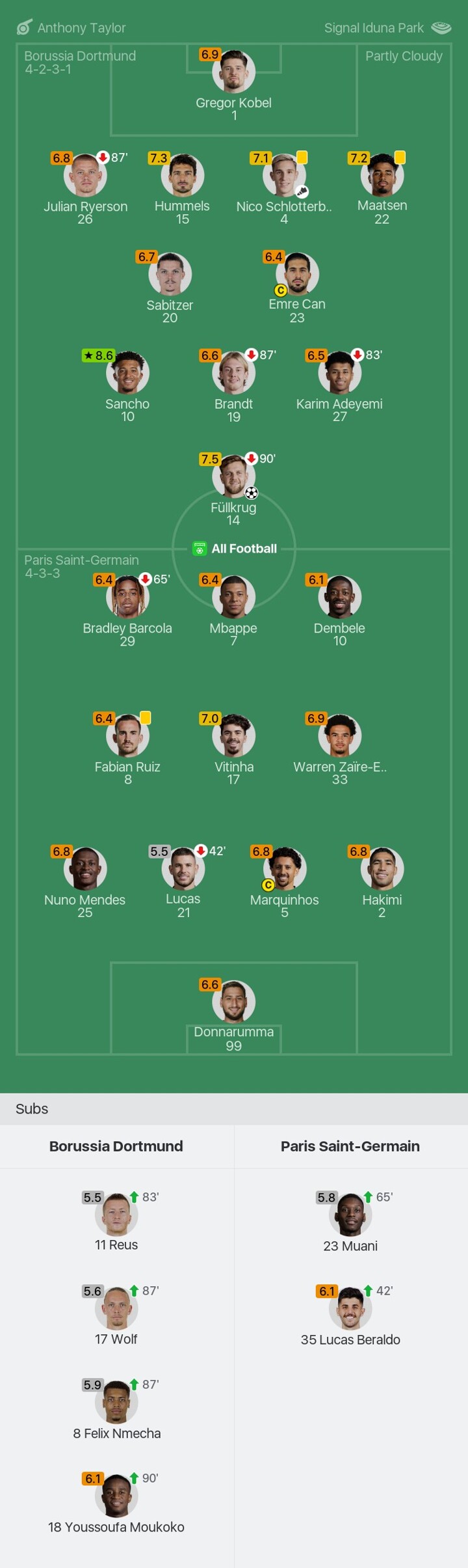 We bring you the player ratings for Borussia Dortmund vs Paris Saint-Germain as Sancho becomes Man of the Match with a rating of 8.6.