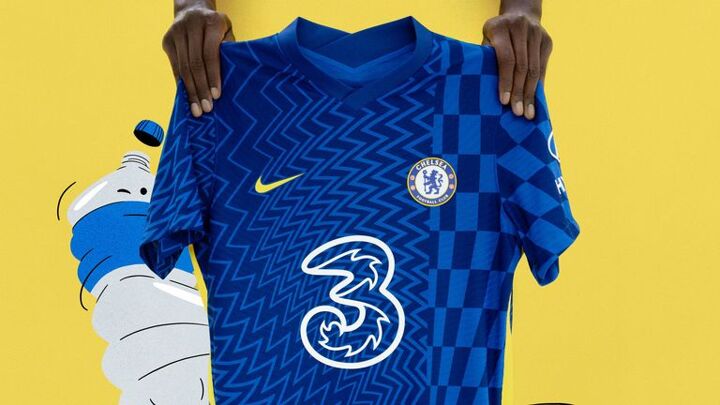 Chelsea's 2021/22 home kit is made with 100 percent recycled polyester fabric and inspired by the "abstract, kaleidoscopic designs of optical art," according to kitmaker Nike.