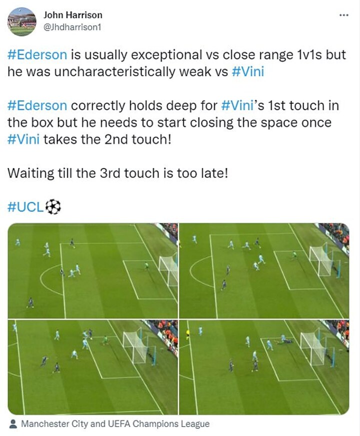 On his Twitter account, Harrison broke down step-by-step how Ederson could have better dealt with Vinicius Junior after he made his way into the City penalty area.