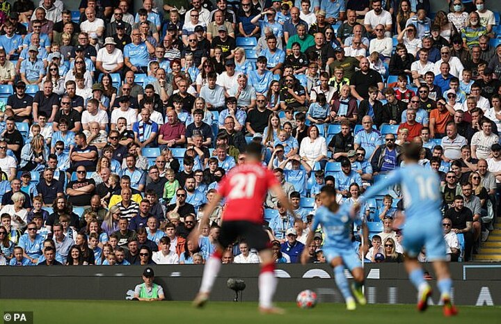 After the victory against RB Leipzig, which was attended by 38,062 fans, Guardiola said: 'The last three games we've played here we've scored 16 goals. I would like more people to come to the next game on Saturday.