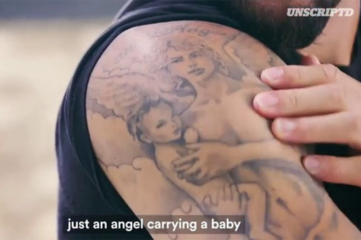His strong family connection is also shown by an angel on his right shoulder for his niece who sadly passed away.