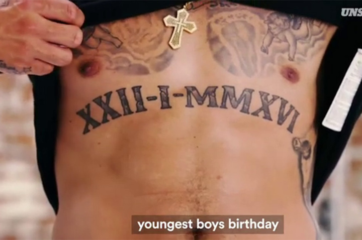 The words "To the stars through difficulties" can also be seen on his right arm, as is a tribute to his grandfather.