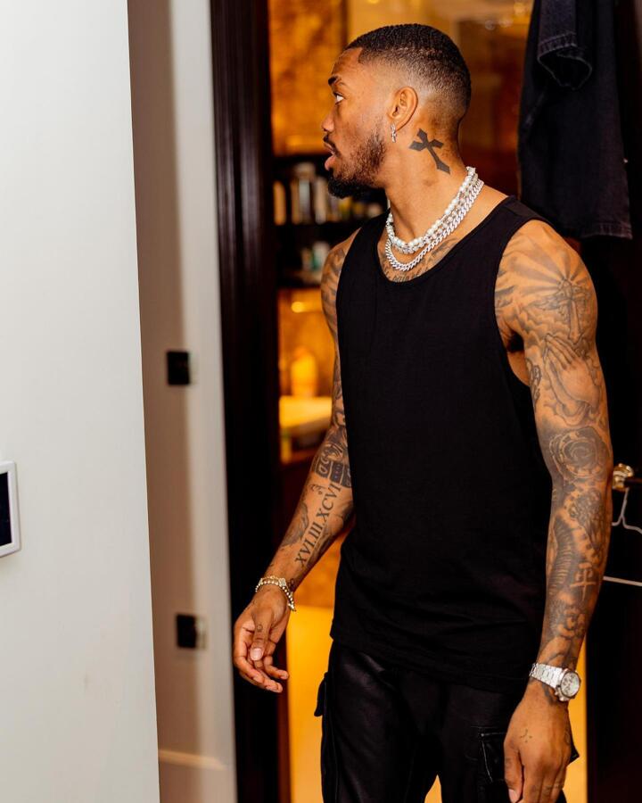 The midfielder has the words "Sky is the limit" going down from his left ear to the bottom of his neck.