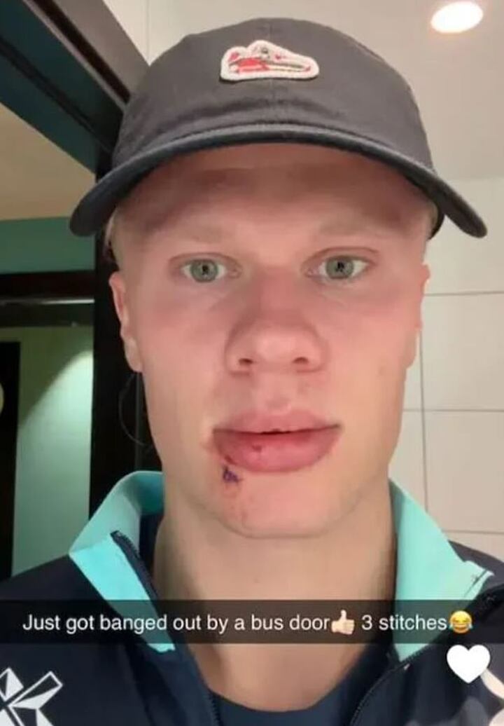 Haaland, 25, was caught in the face when the bus trunk door flew open as he stood nearby, leaving him with a nasty gash that needed three stitches.