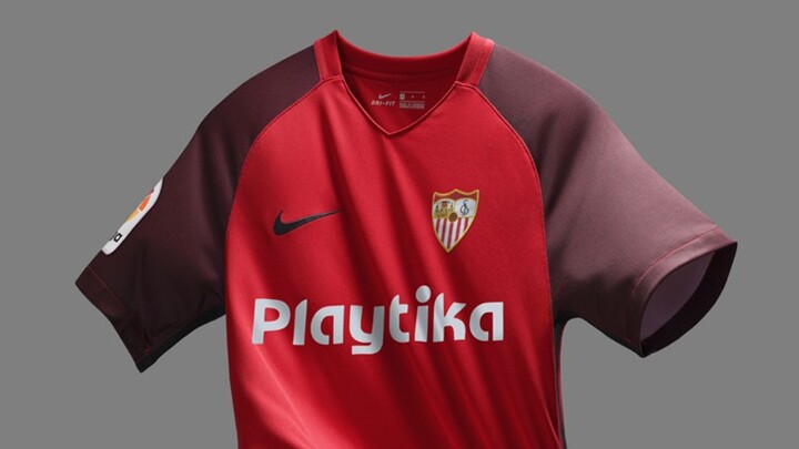 Sevilla - Away Sevilla's away kit for 2018-19 sees the club wear a striking two-tone red number, which has been a stape of Nike kits in recent years. For the Andalusians, the brighter tone of the torso is contrasted with crimson sleeves. Like the home jersey, the collar on the away edition is v-neck.