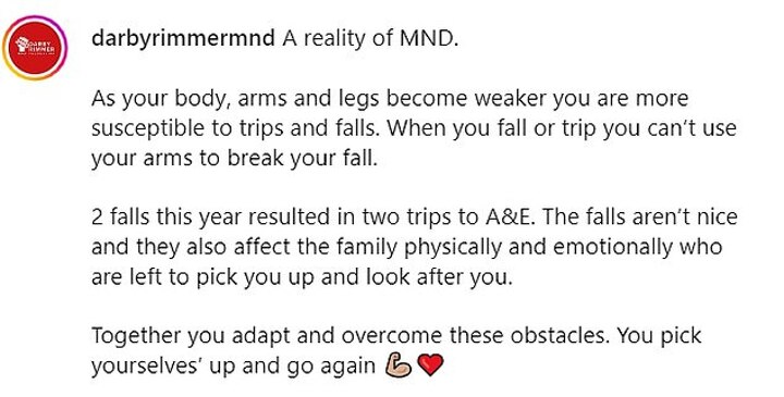 In a post headed 'A reality of MND', he explained to the account's followers how the disease means he's now prone to falls and can no longer break them - and he's had two trips to A&E this year.