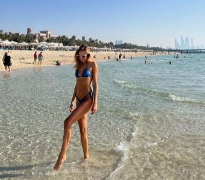 In her latest snap, Viktoria could be seen relaxing in a blue bikini on the beach as she took in the sun.