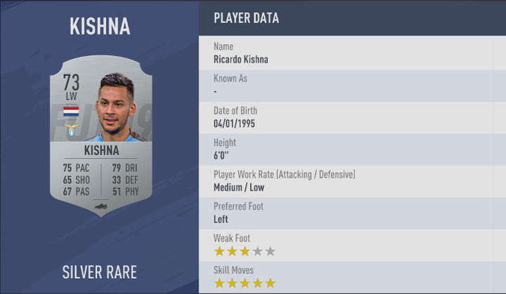 Ricardo Kishna | ADO Den Haag (On loan from Lazio) OVERALL RATING: 73 Pace = 75 Shooting = 65 Passing = 67 Dribbling = 79 Defendin =: 33 Physical = 51