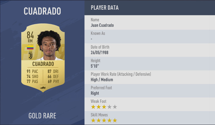 Juan Cuadrado | Juventus OVERALL RATING: 84 Pace = 91 Shooting = 74 Passing = 77 Dribbling = 87 Defending = 66 Physical = 69