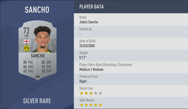 Jadon Sancho | Borussia Dortmund OVERALL RATING: 72 Pace = 85 Shooting = 56 Passing = 62 Dribbling = 82 Defending = 31 Physical = 52