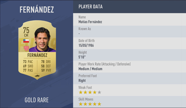 Matias Fernandez | Club Necaxa OVERALL RATING: 75 Pace = 73 Shooting = 69 Passing = 77 Dribbling = 78 Defending = 58 Physical = 59