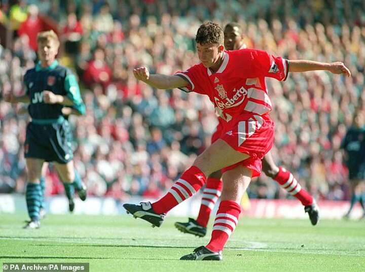 Jamie Redknapp whips a free-kick towards the Arsenal area. Keown rises to clear the ball but mistimes his jump, allowing the ball to drop. It bounces inadvertently off Ian Rush and away from Dixon allowing an unmarked Fowler to lash home a first-time shot with that trusty left boot. He peels away in celebration, exuberant as Anfield adores him.