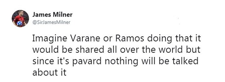 Another added: 'Imagine Varane or Ramos doing that it would be shared all over the world but since it's Pavard nothing will be talked about it.'