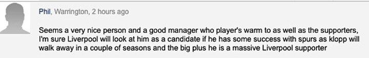 'I'm sure Liverpool will look at him as a candidate if he has some success with Spurs as Klopp will walk away in a couple of seasons and the big plus is he is a massive Liverpool supporter.'