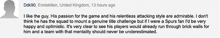 A further reader explained: 'I like the guy. His passion for the game and his relentless attacking style are admirable. I don't think he has the squad to mount a genuine title challenge but if I were a Spurs fan I'd be very happy and optimistic.