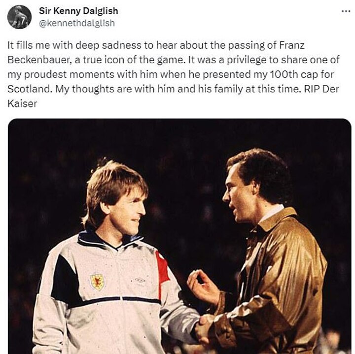 Sir Kenny wrote: 'It fills me with deep sadness to hear about the passing of Franz Beckenbauer, a true icon of the game. It was a privilege to share one of my proudest moments with him when he presented my 100th cap for Scotland. My thoughts are with him and his family at this time. RIP Der Kaiser'