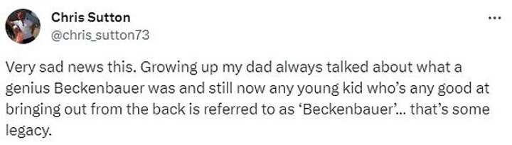 Mail Sport columnist and former striker wrote: 'Very sad news this. Growing up my dad always talked about what a genius Beckenbauer was and still now any young kid who’s any good at bringing out from the back is referred to as ‘Beckenbauer’… that’s some legacy.'
