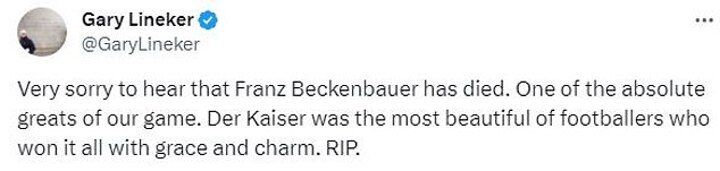 On X (formerly Twitter), England legend Gary Lineker wrote: 'Very sorry to hear that Franz Beckenbauer has died. One of the absolute greats of our game. Der Kaiser was the most beautiful of footballers who won it all with grace and charm. RIP.'