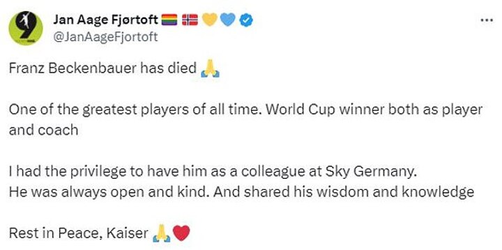 Norway's Jan Aage Fjortoft, who worked with him on television in Germany, wrote: 'Franz Beckenbauer has died.