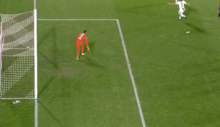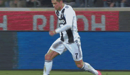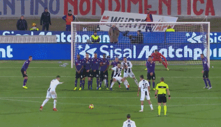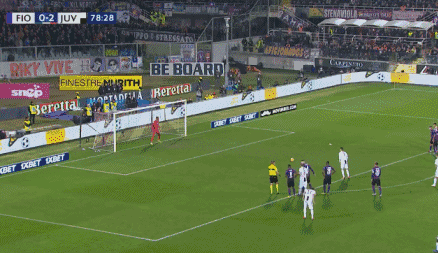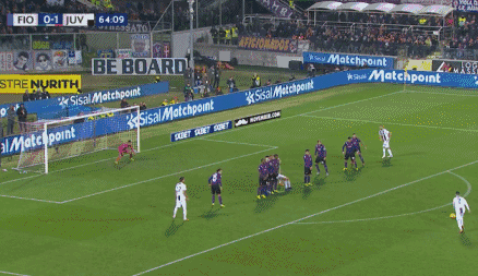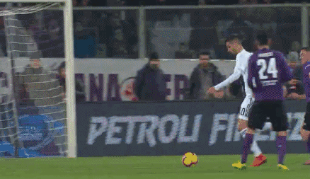 Ronaldo stands in the middle of three Fiorentina defenders and attempts to head it in, but he misses the chance. Even still, no Fiorentina players are able to whack it out, and the ball bounces over the line!