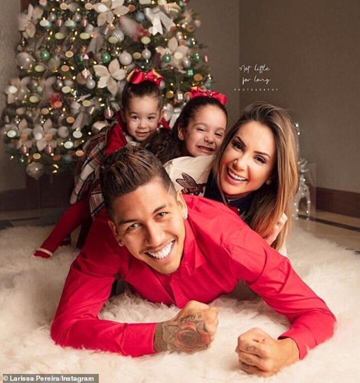 The photo showed Firmino lying on the floor of a room in their home with his wife and daughters - Bella and Valentina - lying on top of him. The caption alongside the photo read: 'Strong daddy. Good luck today. We LoveYou.'
