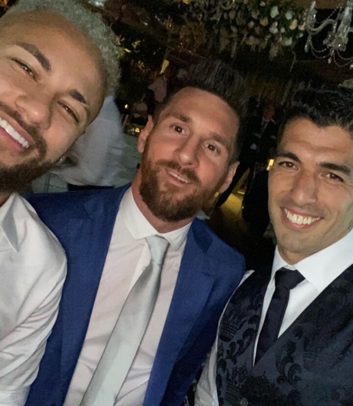 The trio was back together as Barcelona striker Suarez renewed his wedding vows to wife Sofia Balbi at a star-studded bash in Uruguay.
