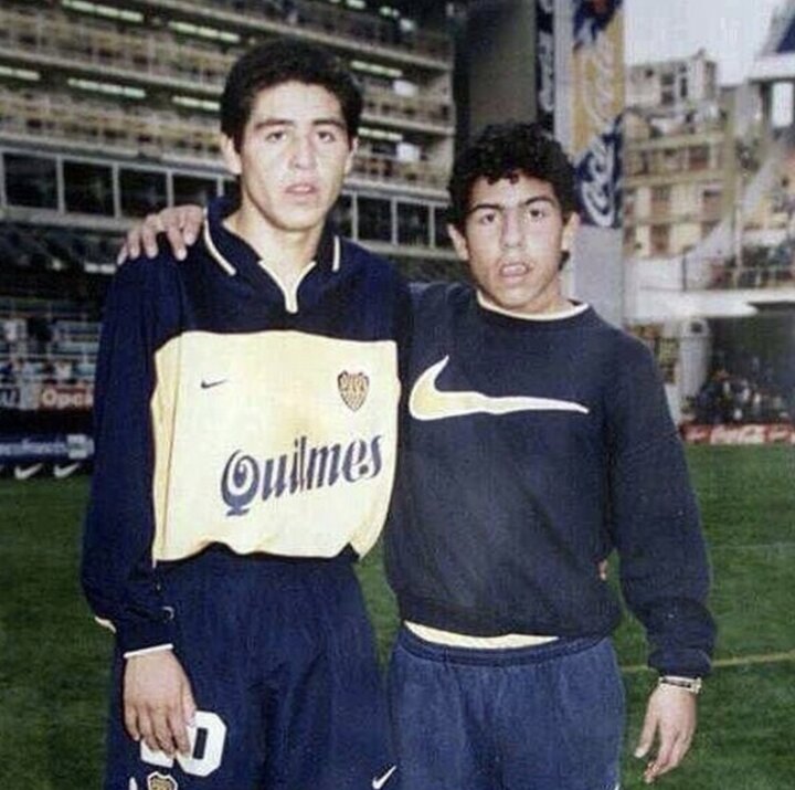 Tevez is instantly recognisable as a young lad in this brilliant photo with Boca Junior legends Juan Roman Riquelme.