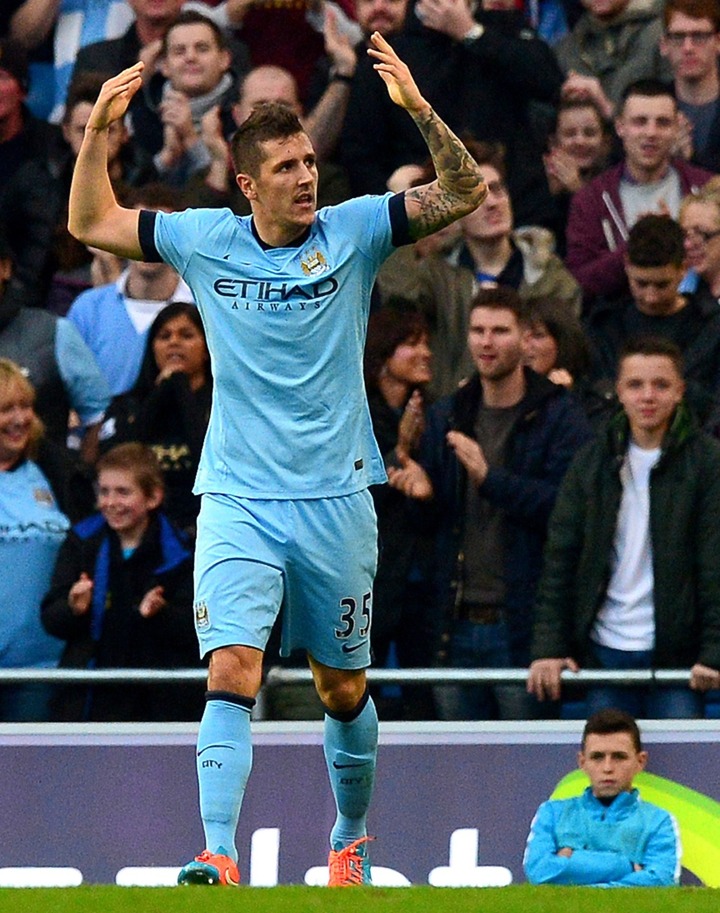 As Stevan Jovetic celebrates scoring for Manchester City against Swansea, a boy in the background looks on.