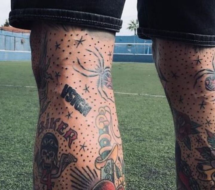 Not only does Agger have a spider drawn on his leg but he also has matching cobwebs which appear on his right knee while above his left knee sits an all-seeing eye.