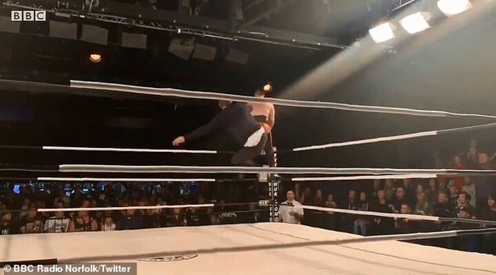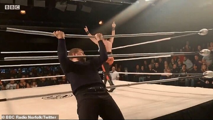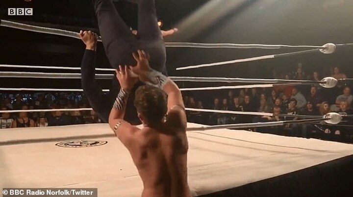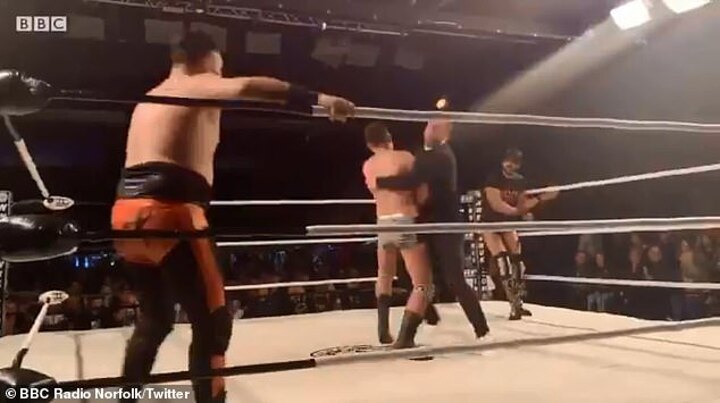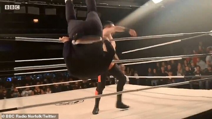 Holt had a close call after being thrown over the top rope before he managed to climb back into the ring to drop-kick his opponent out of the ring and get his wrestling career off to the best start possible.