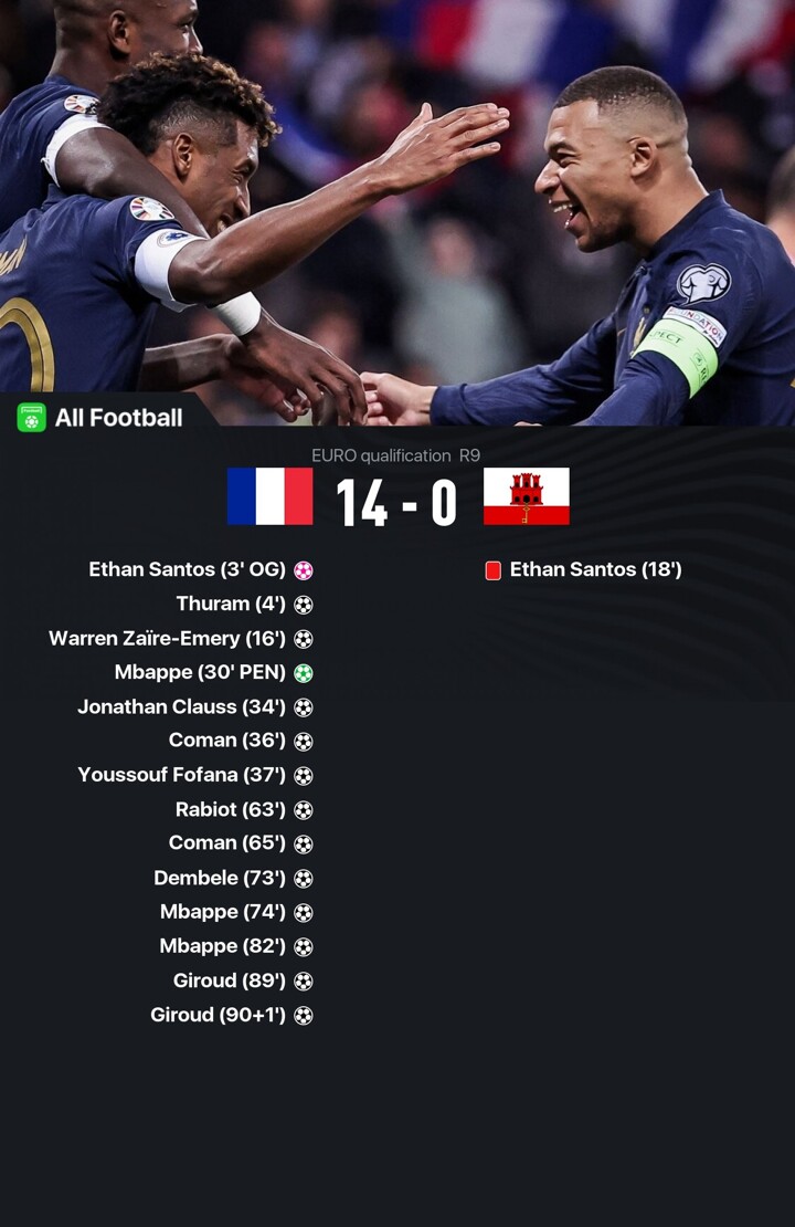 France beat Gibraltar 14-0 and it’s the biggest win in their national team history.
