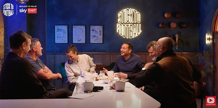 The pair were sat around a breakfast table alongside Jill Scott, Roy Keane, Gary Neville and Ian wright, who were all in hysterics. Wright added: 'I love it!'
