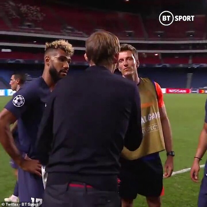 He was seen firing off some choice words and pointing angrily in the direction of Leipzig's fitness coach Daniel Behlau, while PSG players Eric Maxim Choupo-Moting and Thilo Kehrer were forced to sheepishly watch on.