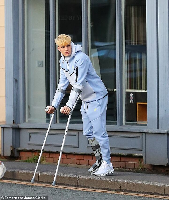 Garnacho had last week been spotted in town wearing a protective 'moon boot' and on crutches as he enjoyed lunch with friends and family in Hale.