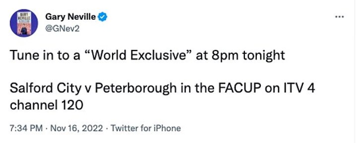 On Wednesday night, Neville posted a craftily-timed tweet at 7.34pm - 26 minutes before the start of the Ronaldo interview - that read: 'Tune in to a 'World Exclusive' at 8pm tonight. Salford City vs Peterborough in the FACUP on ITV4 channel 120.'