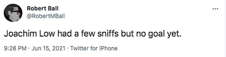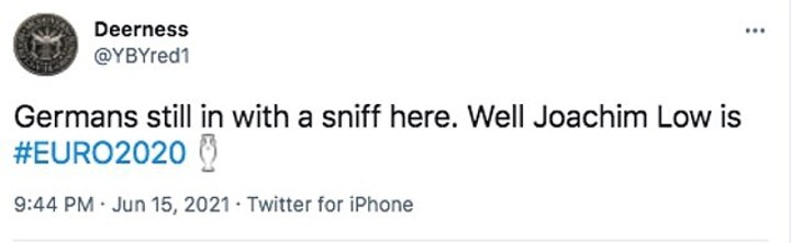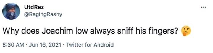 A few other users joked at Low's actions whilst his side were trailing, with one saying: 'Joachim Low had a few sniffs but no goal yet,' and another 'Germans still in with a sniff here. Well Joachim Low is.'
